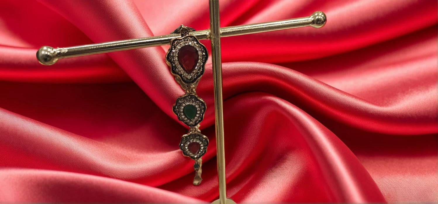 A stunning vintage-style bracelet featuring alternating ruby-red and emerald-green teardrop stones, each surrounded by a halo of sparkling crystals. Set in an antique gold-tone base, this piece is perfect for weddings, festive occasions, or adding a royal flair to any outfit.